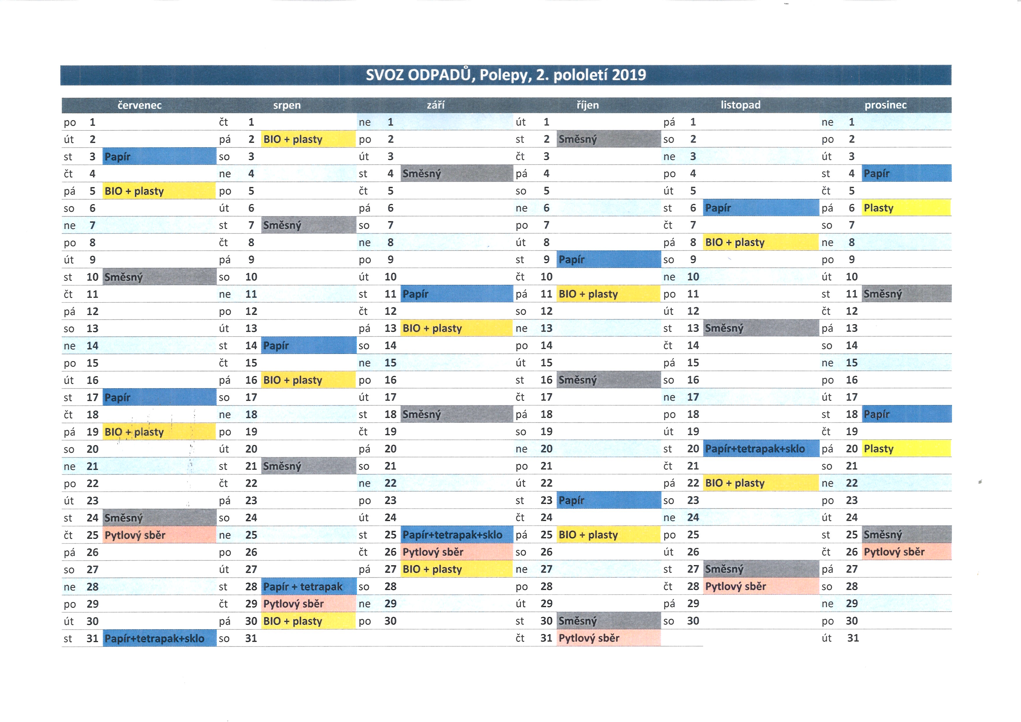 Harmonogram svozů odpadů na 2. pololetí 2019