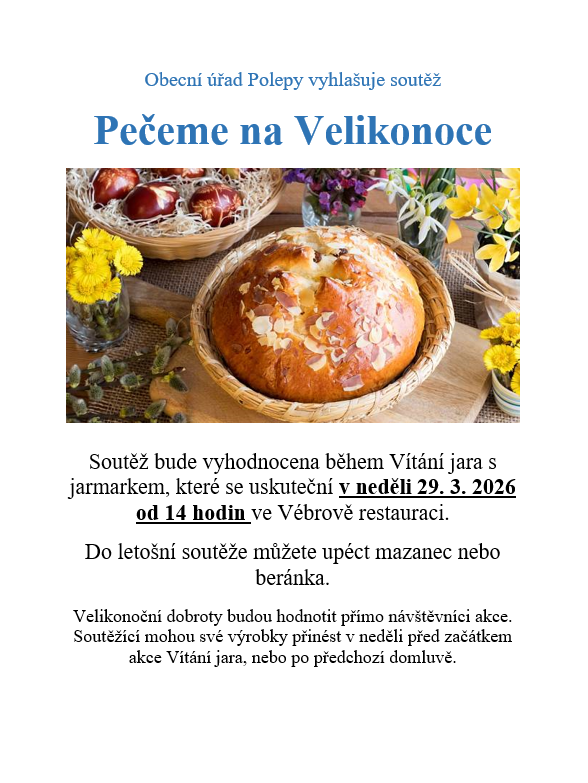 Soutěž vyhodnotíme během Vítání jara s jarmarkem, které se uskuteční v neděli 29. března od 14 hodin ve Vébrově restauraci. Velikonoční mazance a beránky budou hodnotit přímo návštěvníci akce a také zde proběhne vyhlášení vítězů.