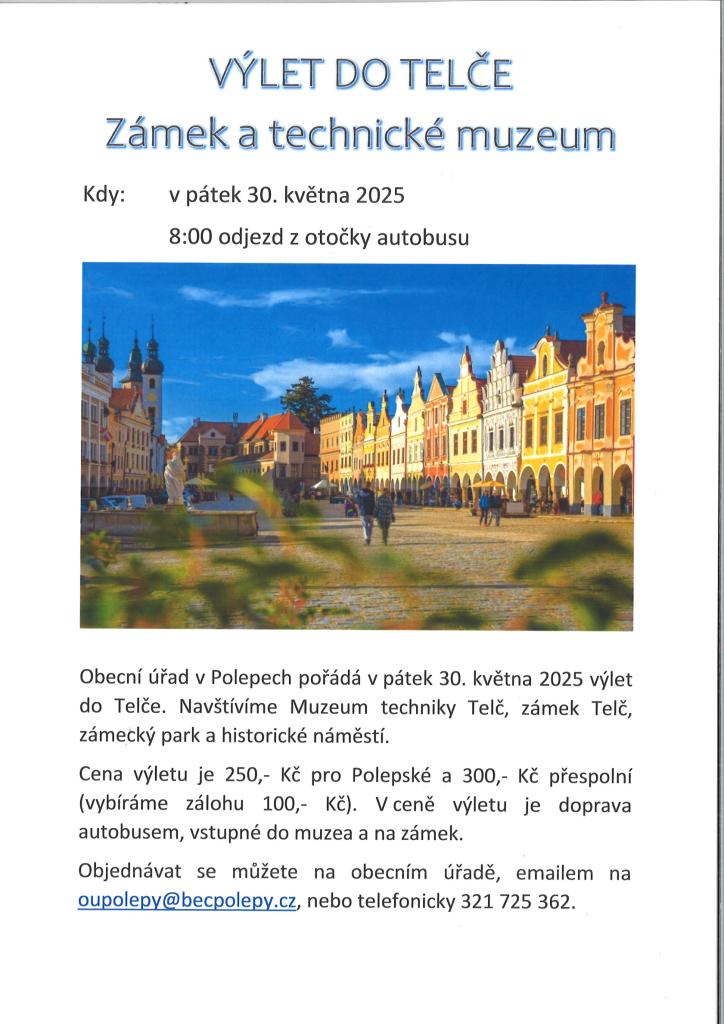 Cena výletu je 250,- Kč pro Polepské a 300,- Kč přespolní (vybíráme zálohu 100,- Kč). V ceně výletu je doprava autobusem, vstupné do muzea a na zámek.